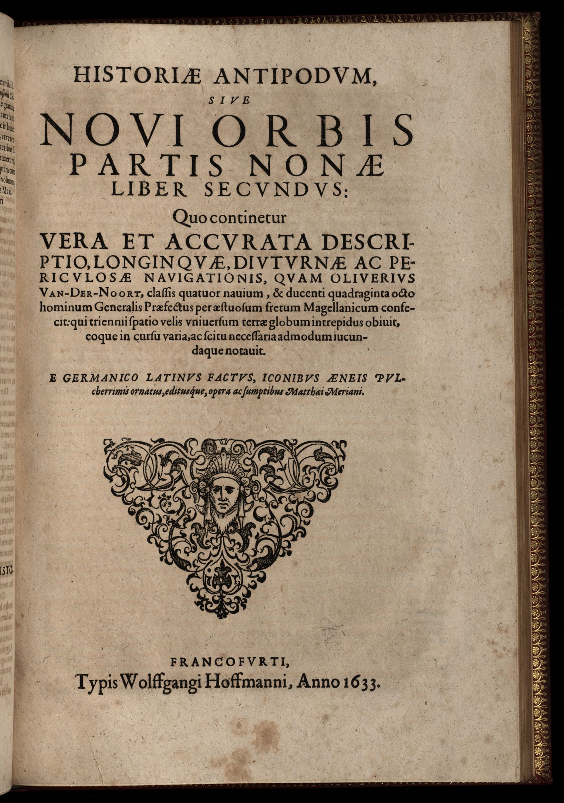 Historiae antipodum sive novi orbis, qui vulgo Americae et Indiae Occidentalis nomine usurpatur, pars nona : continens veram et genuinam descriptionem duarum nauigationum Hollandicarum, quas Bataui in diuersas orbis partes magno animo, et si varia fortuna susceperunt. I. Et primo quidem libro narratur, quo pacto quinq[ue] naues, quae Amsterdamo soluerant.