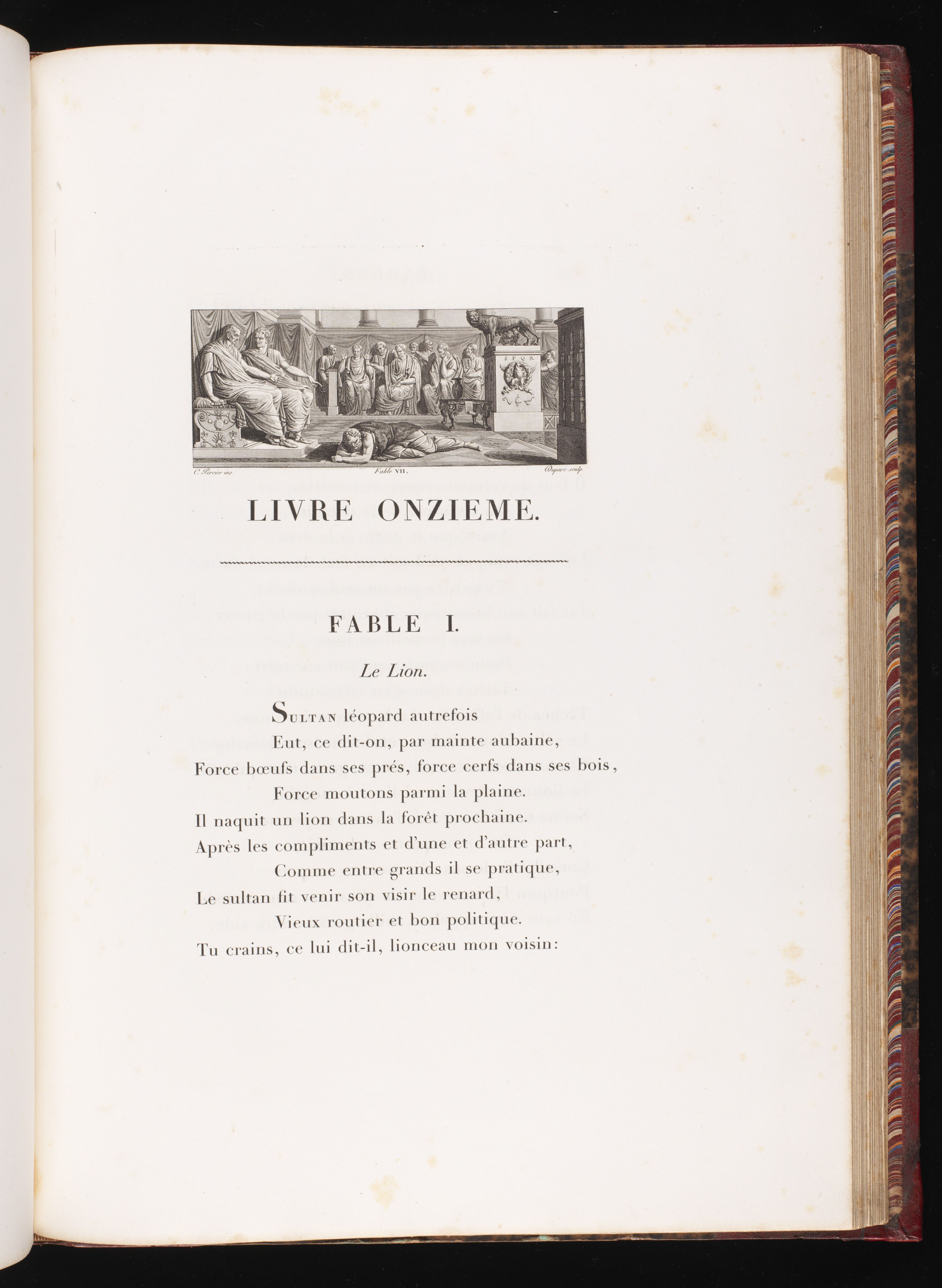 Cette édition imprimée en caractères Didot et illustrée par Charles Percier parachève, sur un plan purement matériel, la classicisation des Fables de La Fontaine opérée par les pièces liminaires des éditions des années 1750-1770.