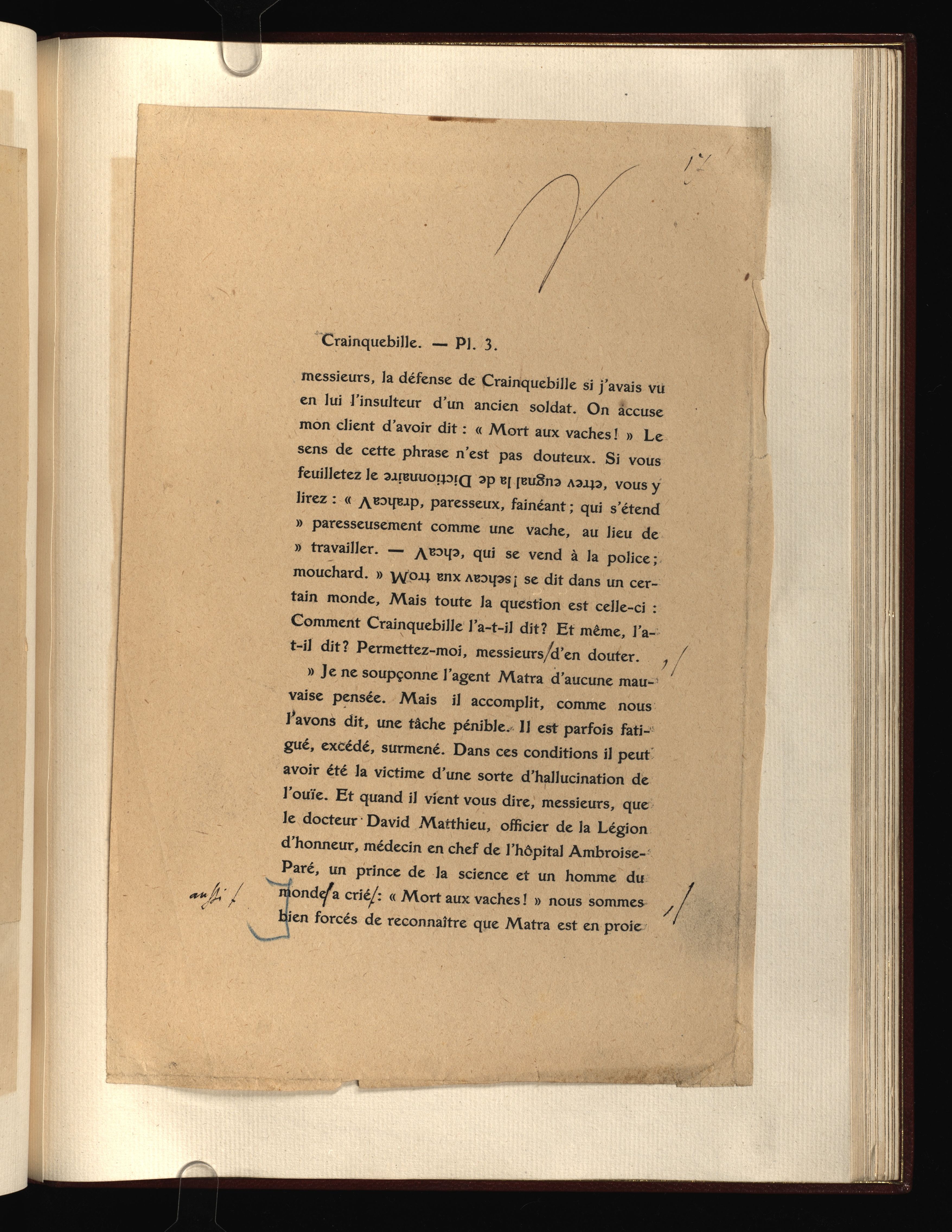 Manuscrit autographe signé des chapitres I - III avec premières premières épreuves corrigées par l'auteur. Premier état connu du texte: titre inital Histoire contemporaine - Jérôme Crainquebille corrigé en Histoire contemporaine - L'affaire Crainquebille.