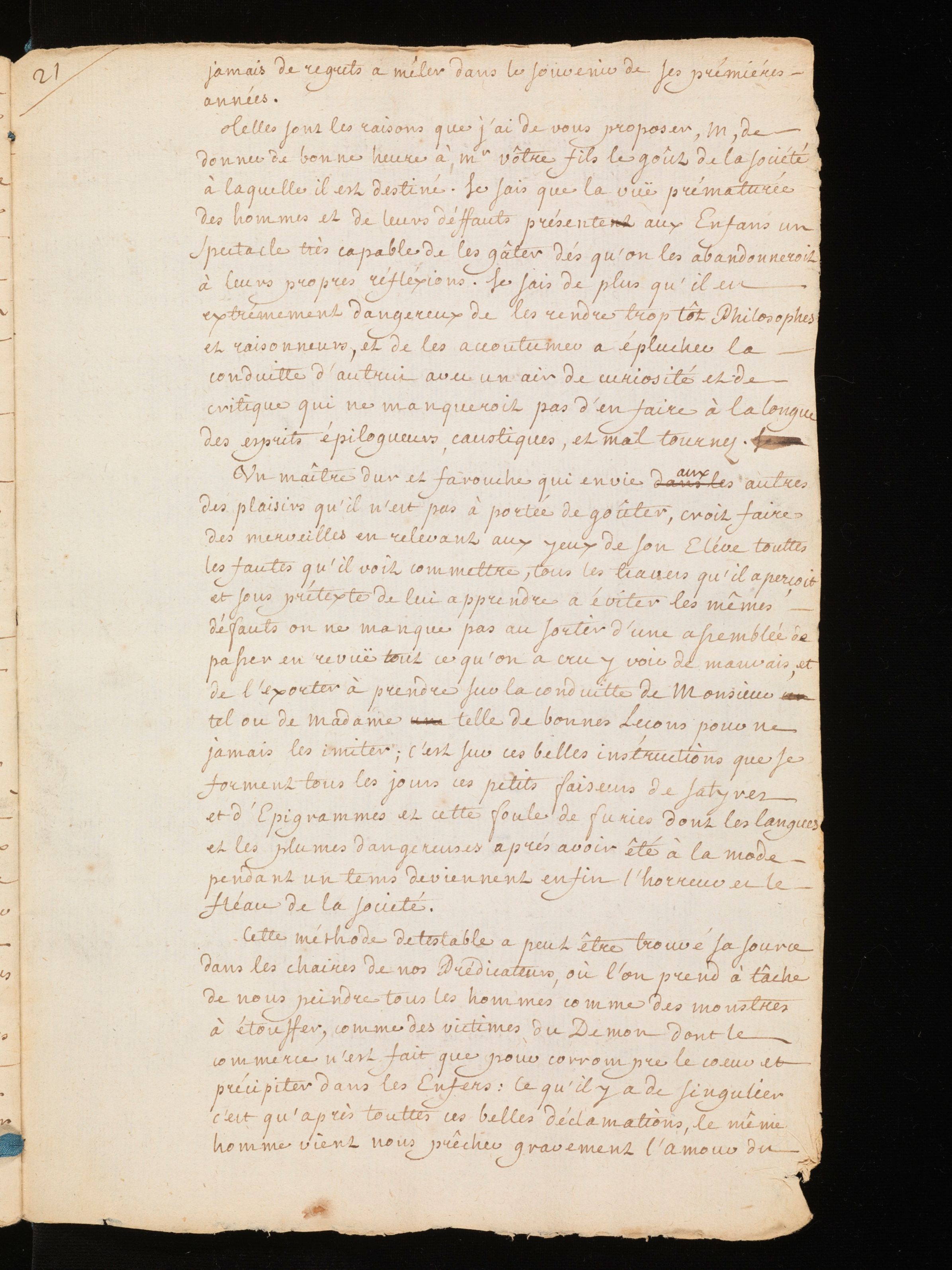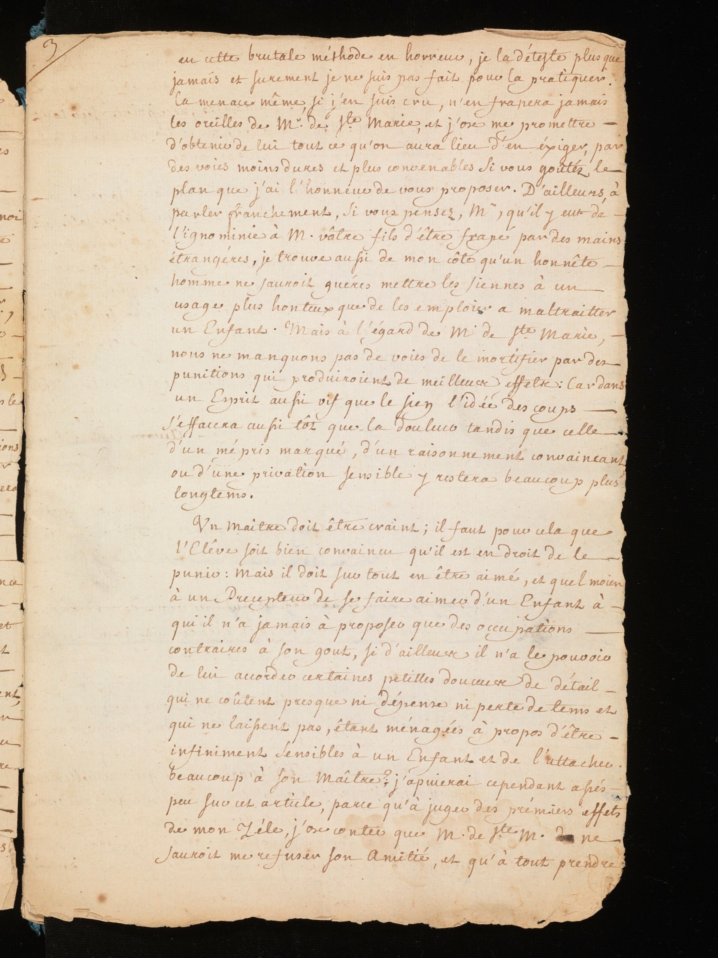 Manuscrit autographe (copie d’auteur ), avec corrections autographes et allographes. Rousseau indique à M. de Mably les principes d’éducation qu’il compte appliquer auprès de ses fils. Le projet est composé selon un ordre rigoureux. Il s’agit d’abord de s’attacher aux capacités propres à l’élève afin de développer une méthode d’enseignement qui lui soit adéquate. Il faut aussi pouvoir délimiter de manière précise l’autorité du précepteur ainsi que celle du père, cette-dernière devant être soumise préalablement à l’avis du précepteur. La question de l’autorité est également l’occasion d’un détour sur le caractère difficile de Sainte-Marie, le fils aîné, qui s’annonce difficile à éduquer.