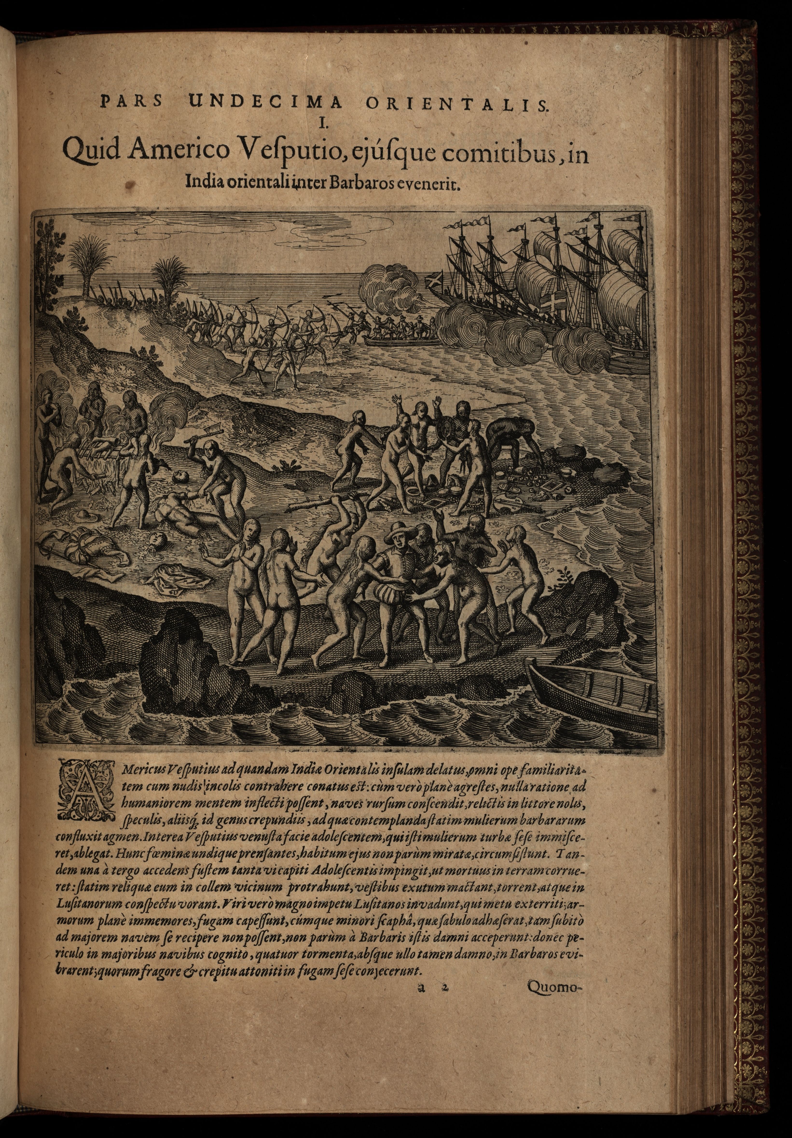 Sequuntur verae et genuinae rerum praecipuarum quarum in Americi Vesputii versus Indiam Orientalem navigationibus, ut & reliquis duabus in Cambajam & Spitzbergam expeditionibus fit mentio, repraesentationes, ad XI. Indiae Orientalis partem referendae additae sunt breves et unius cuiusque figurae descriptiones. Nunc primum eleganter in aes incisae & in lucem editae. Studio & operâ Johann-Theodori de Bry civis ac Bibliopole Oppenhemensis.