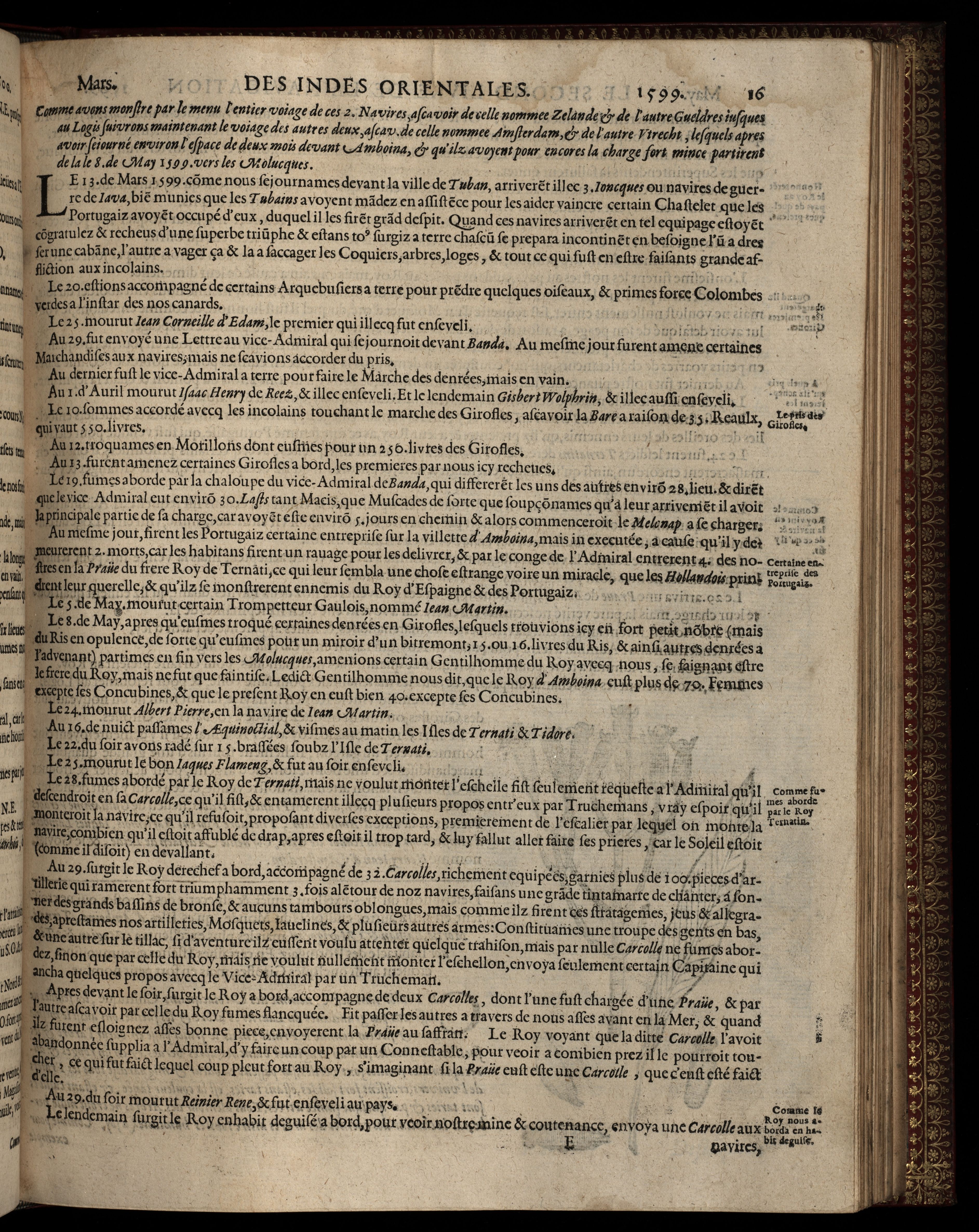 Le second livre, iournal ou comptoir contenant le vray discours et narration historique du voiage faict par les huict navires d'Amsterdam au mois de mars l'An 1598, soubs la conduitte de l'Admiral Iaques Corneille Necq, & du vice-admiral VVibrant de VVarvvicq : de leur voiage, & choses plus memorables, eux audit voiage survenues, de leur riche charge, & sain retour.