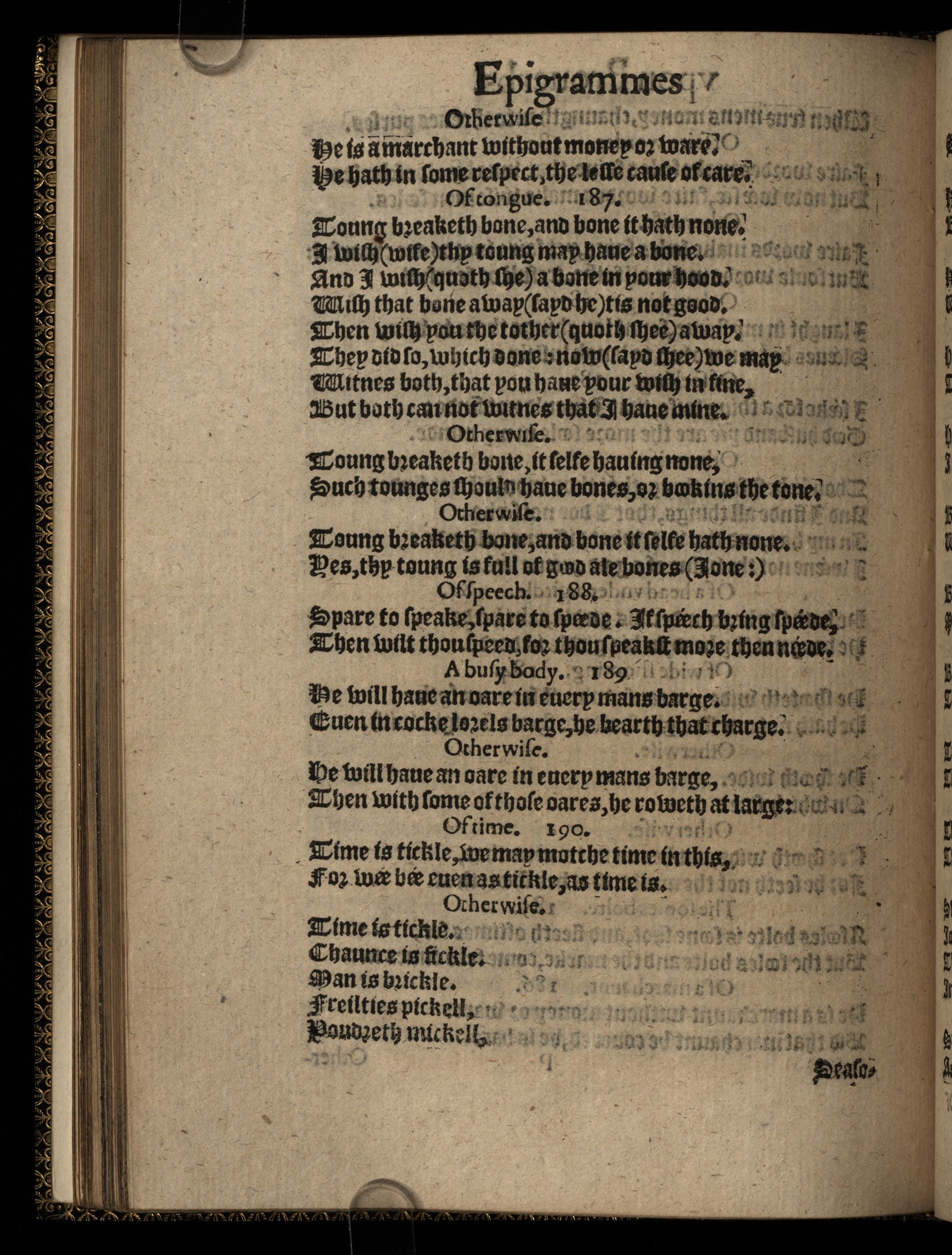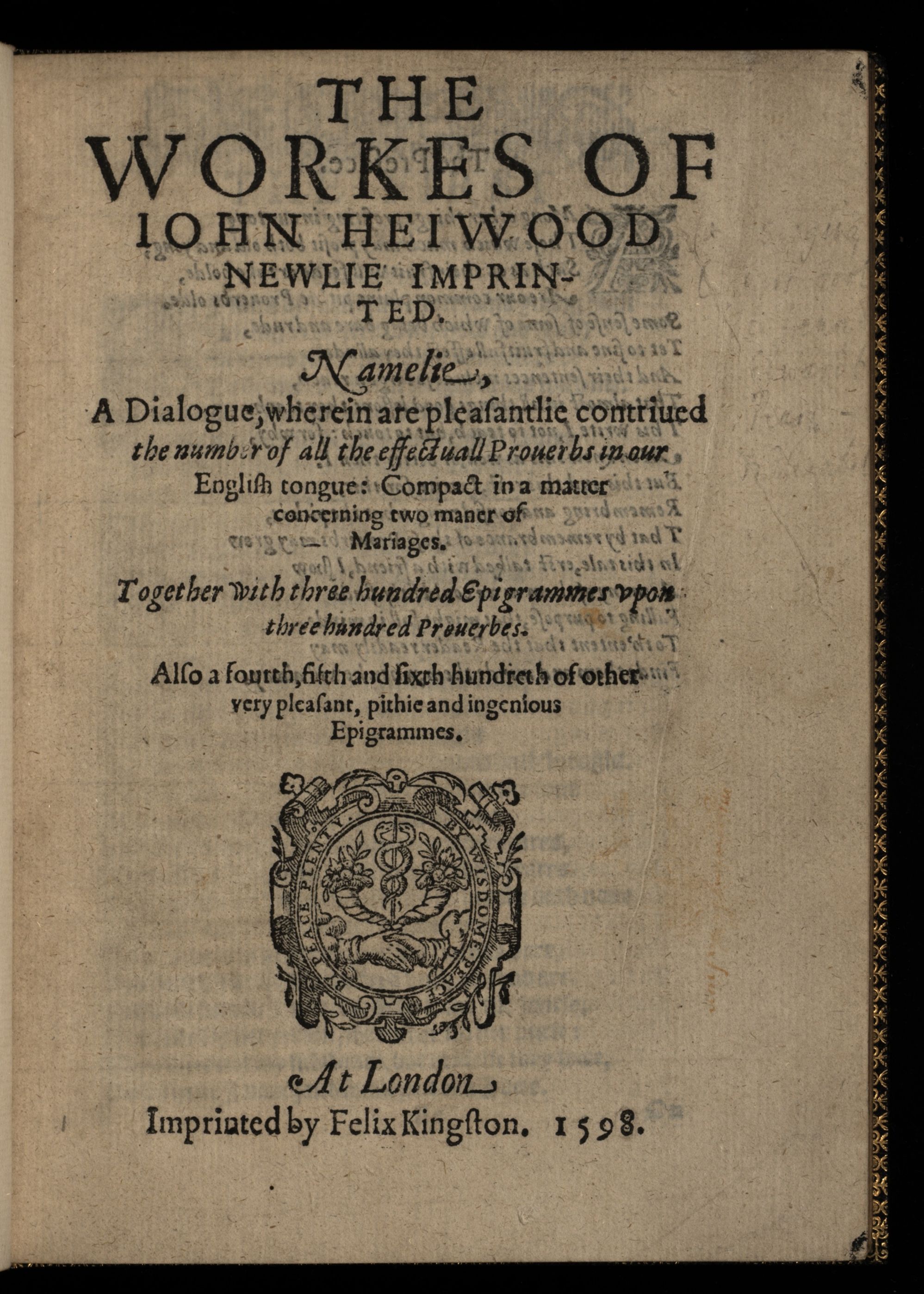 The Workes of Iohn Heiwood Newlie Imprinted. Namelie, A Dialogue, wherein are pleasantlie contriued the number of all the effectuall Prouerbs in our English tongue: Compact in a matter concerning two maner of Mariages. Together with three hundred Epigrammes vpon three hundred Prouerbes. Also a fourth, fifth and sixth hundreth of other very pleasant, pithie and ingenious Epigrammes.