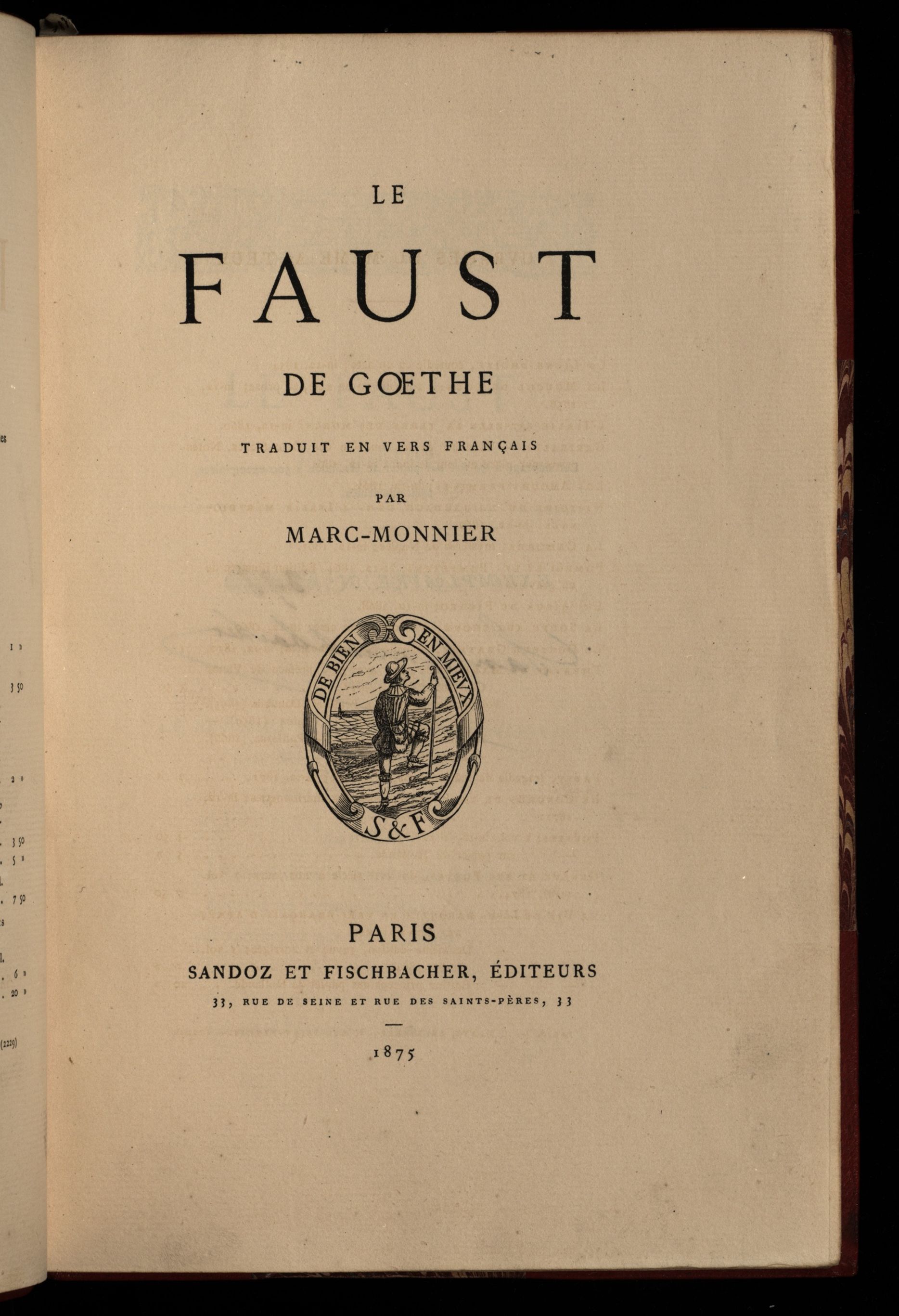 Le Faust de Goethe traduit en vers français par Marc-Monnier.